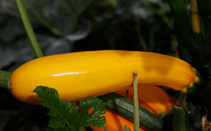 濃い黄色の皮のズッキーニ。肉類との油炒めや揚げ物に合います。